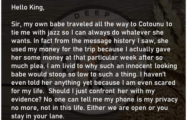 Sir, my own babe traveled all the way to Cotounu to tie me with jazz so | can always do whatever she wants. In fact from the message history | saw, she used my money for the trip because | actually gave her some money at that particular week after so much plea. | am livid to why such an innocent looking babe would stoop so low to such a thing. | haven’t even told her anything yet because | am even scared for my life. Should | just confront her with my evidence? No one can tell me my phone is my privacy no more, not in this life. Either we are open or you stay in your lane.”