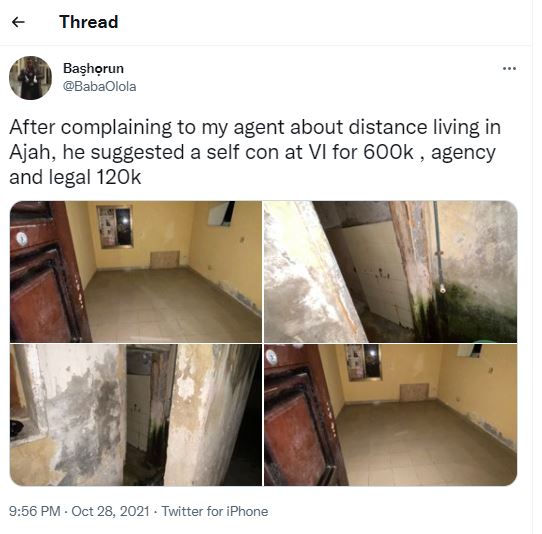 “After complaining to my agent about distance living in Ajah, he suggested a self con at VI for 600k , agency and legal 120k”