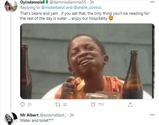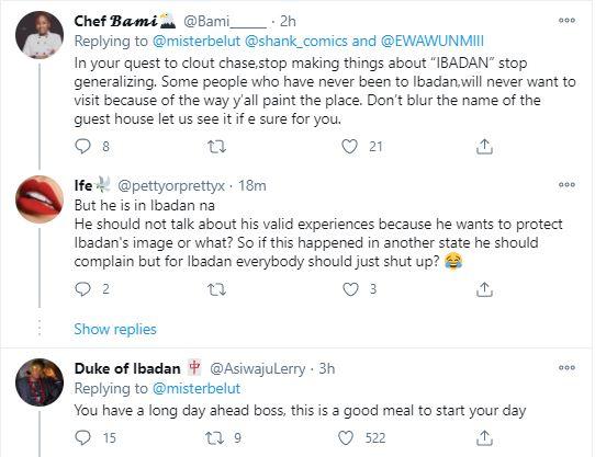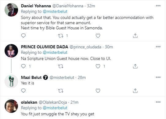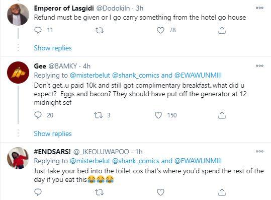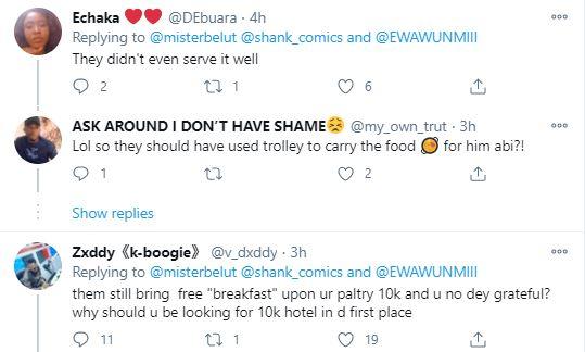 “So I went to Ibadan yesterday and lodged in one hotel like that, I paid 10k and 650 for vat for the night, so this morning they brought me breakfast. I don die Crying face.