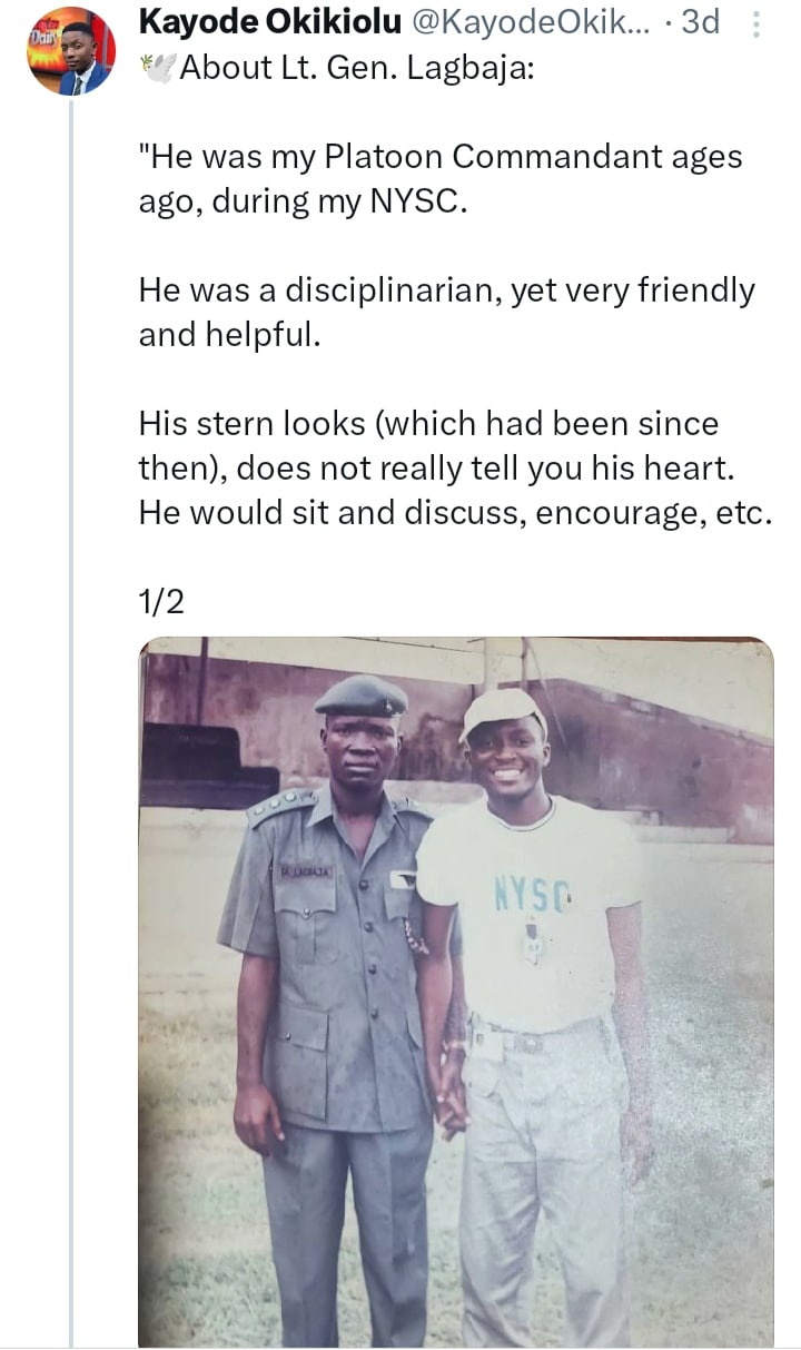Kayode Okikiolu revealed that Lt. Gen Lagbaja was his platoon commandant at the NYSC camp he did his orientation, years ago.