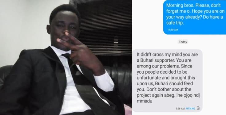 Man loses ₦3.4 million contract for being a President Buhari supporterA Nigerian man simply identified as Architect Bolu, took to social media to narrate how he lost a N3.4 million contract because he is a die-hard supporter of the Buhari-led administration.