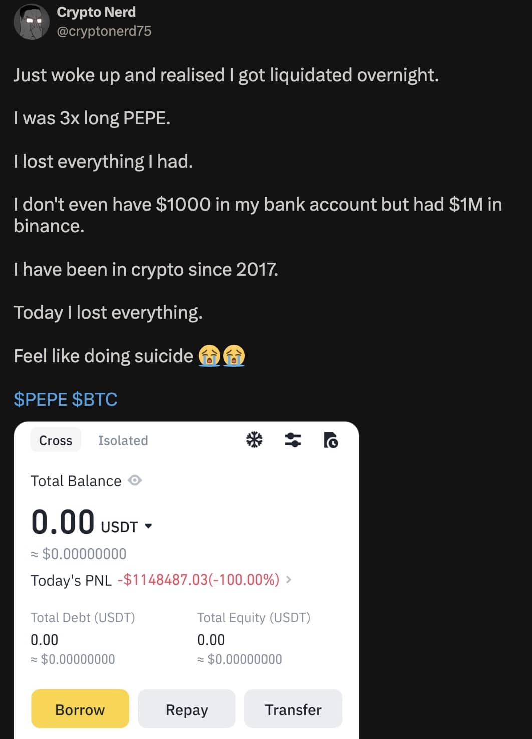 “Just woke up and realised I got liquidated overnight. I was 3x long PEPE. I lost everything I had. I don’t even have $1000 in my bank account but had $1M in finance. I have been in crypto since 2017.