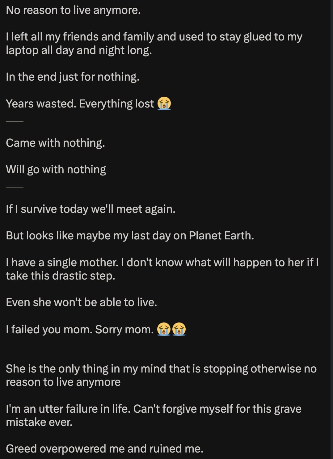 “Today I lost everything. Feel like doing suicide 😭😭. No reason to live anymore. I left all my friends and family and used to stay glued to my laptop all day and night long. In the end just for nothing.