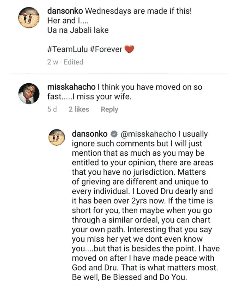 Meanwhile, Dan Sonko once told off a fan who said he has moved on so fast after losing his wife. The fan identified as Miss Kahacho, who claimed to have known Dru wrote;