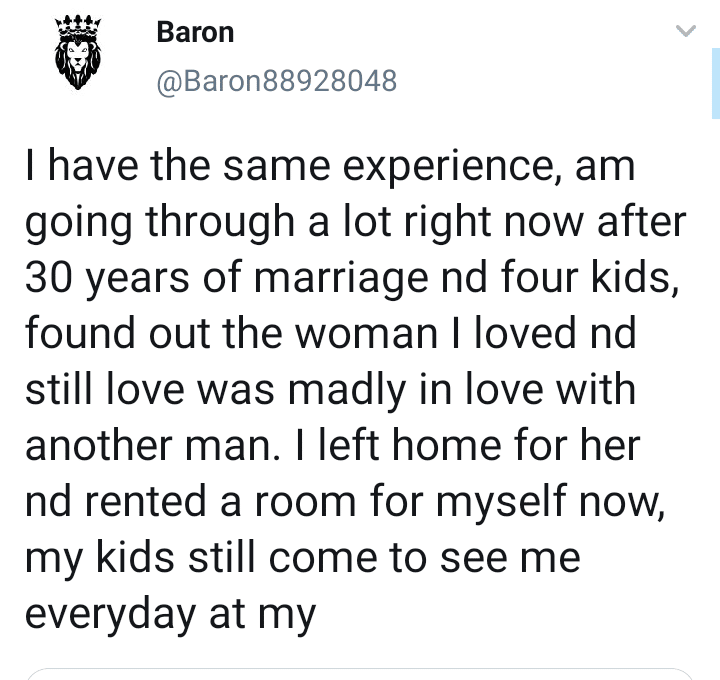 Positing that marriage is a fraud, Baron wrote: “I have the same experience, am going through a lot right now after 30 years of marriage nd four kids, found out the woman I loved nd still love was madly in love with another man.