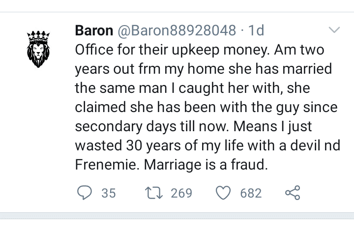 Lamenting how he had wasted 30 years of his life with a ‘devil and frenemie’, the man stated that his wife confessed that she has been with the guy she’s cheating with since her secondary school days.