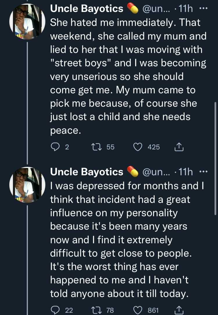 According to a Twitter user, @Unclebayotics, the traumatic experience left an impression on him which led to being kicked out of her aunt’s house as a result of her religious beliefs.