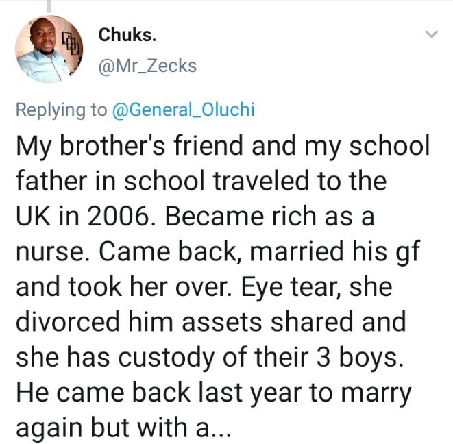 “My brother’s friend and my school father in school traveled to the UK in 2006. Became rich as a nurse. Came back, married his gf and tool her over. Eye tear, she divorced him assets shared and she has custody of their 3 boys.