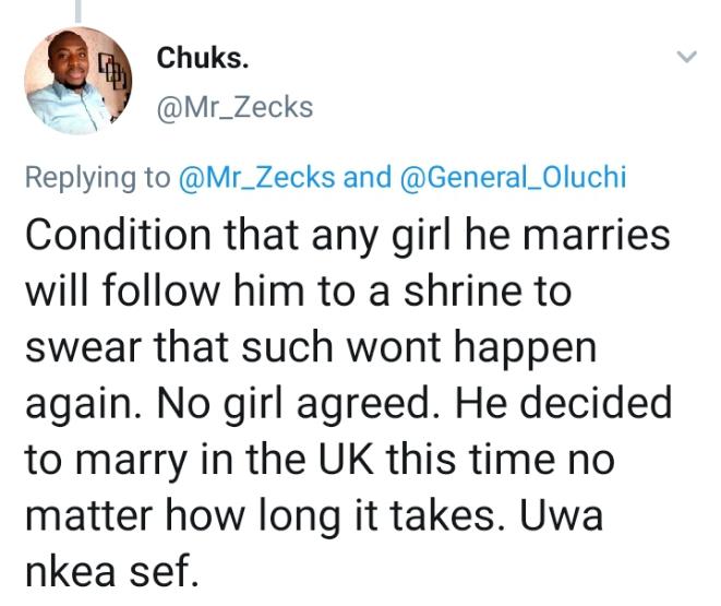 He came back last year to marry again but with a condition that any girl he marries will follow him to a shrine to swear that such wont happen again. No girl agreed. He decided to marry in the UK this time no matter how long it takes. Uwa nkea sef”, Zecks wrote.