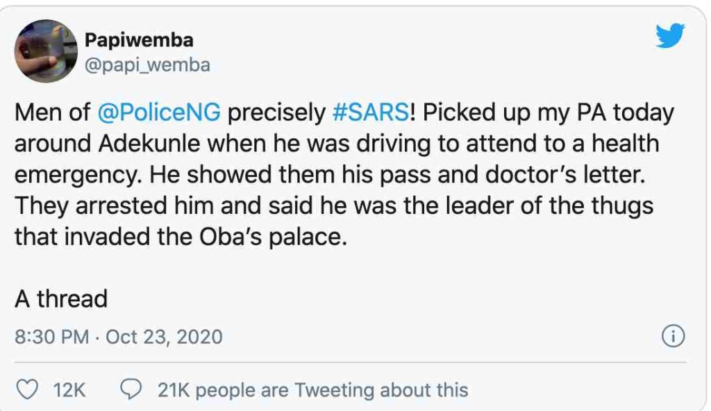 “Men of @PoliceNG precisely #SARS! Picked up my PA today around Adekunle when he was driving to attend to a health emergency. He showed them his pass and doctor’s letter. They arrested him and said he was the leader of the thugs that invaded the Oba’s palac