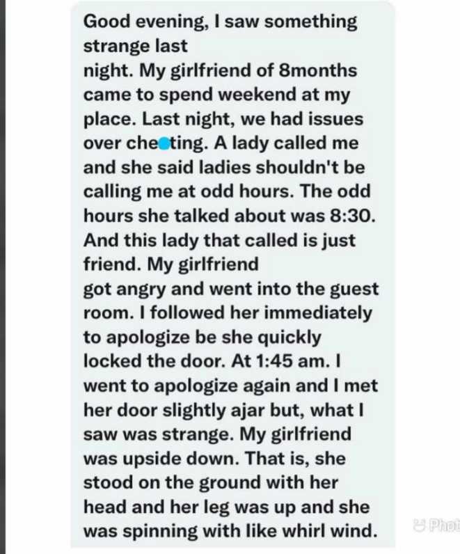 “I saw something strange last night. My girlfriend of 8 months came to spend weekend at my place. Last night, we had issues over cheating. A lady called me and she said ladies shouldn’t be calling me at odd hours.