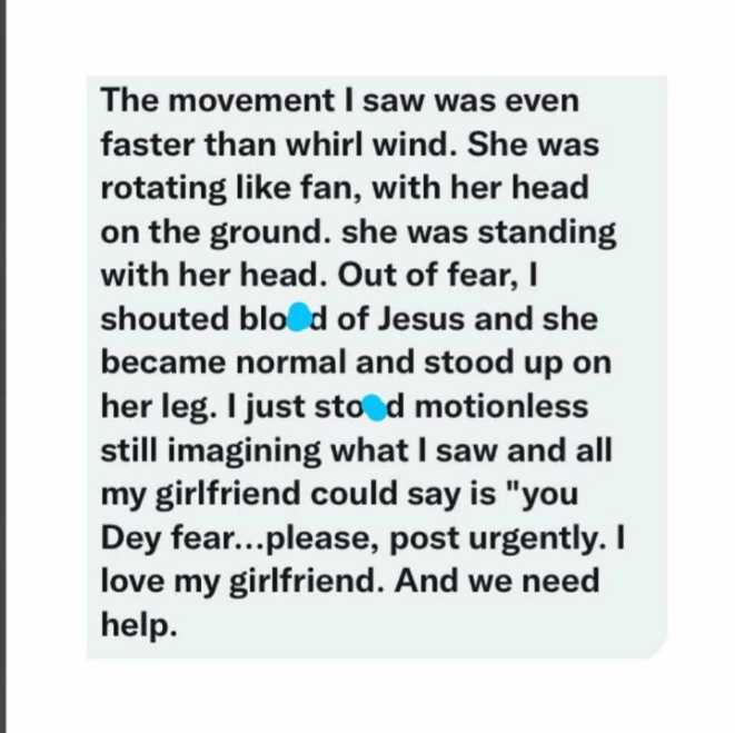 At 1:45 a.m, I went to apologize again and I met her door slightly ajar but what I saw was strange. My girlfriend was upside down. That is, she stood on the ground with her head and her leg was up and she was spinning like whirl wind”.