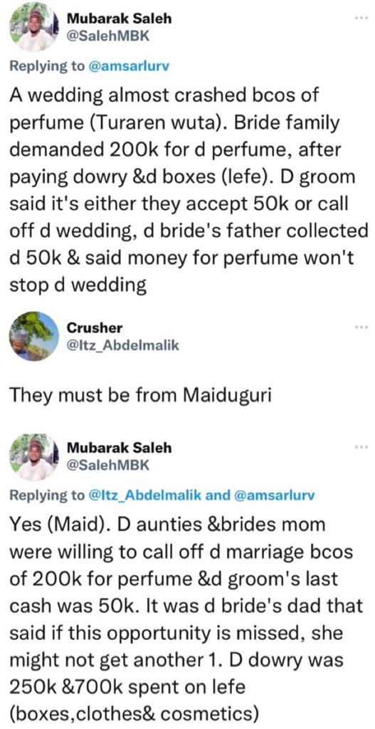 “A wedding almost crashed bcos of perfume (Turaren wuta). Bride family demanded 200k for d perfume, after paying dowry &d boxes (lefe). D groom said it’s either they accept 50k or call off d wedding, d bride’s father collected d 50k & said money for perfume won’t stop d wedding”