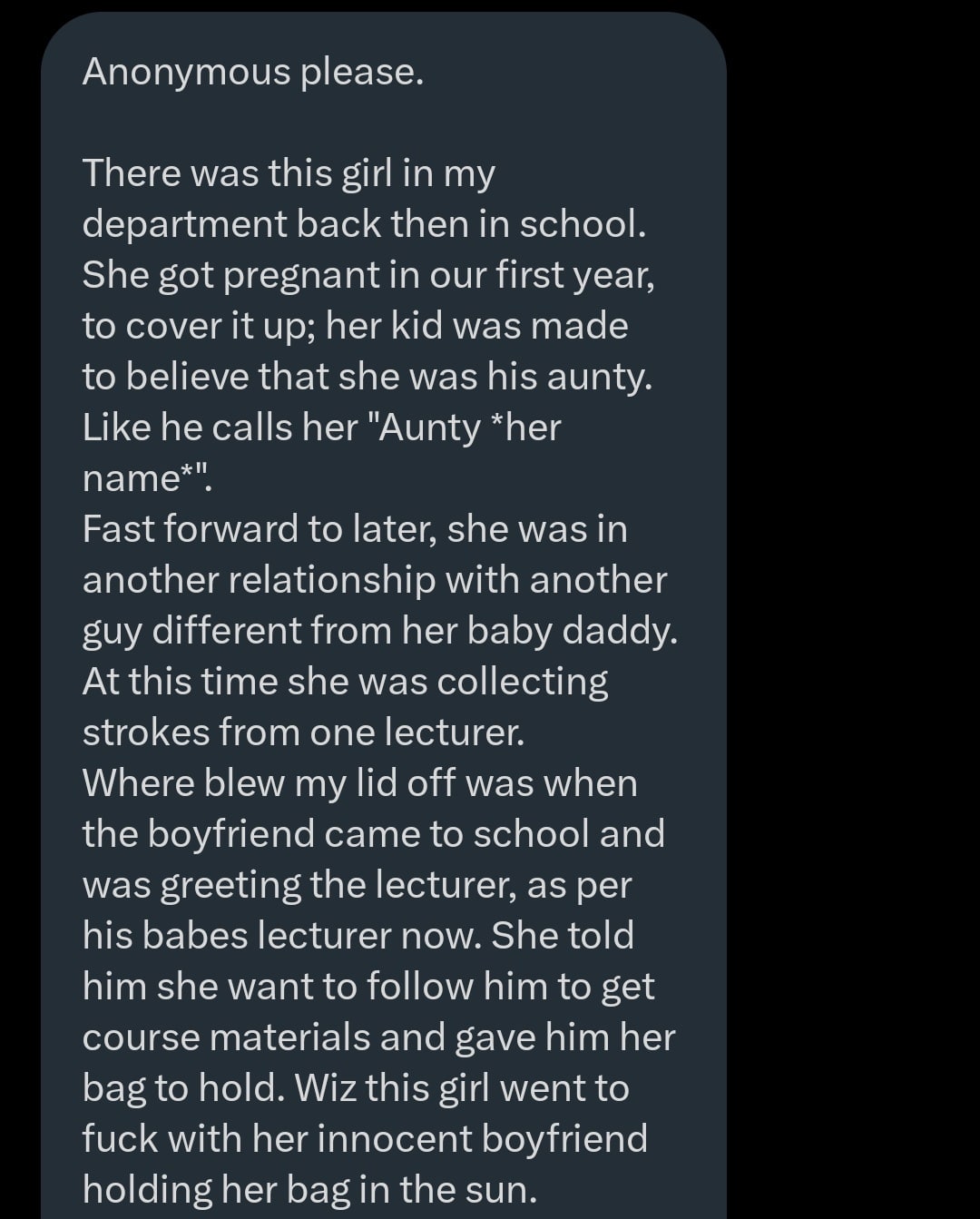 The man wrote, “There was this girl in my department back then in school. She got pregnant in our first year. To cover it up, her kid was made to believe that she was his aunt. He calls her ‘Aunty’, Fast forward to later, she was in another relationship with a different guy, separate from her baby daddy, while also seeing a lecturer.”