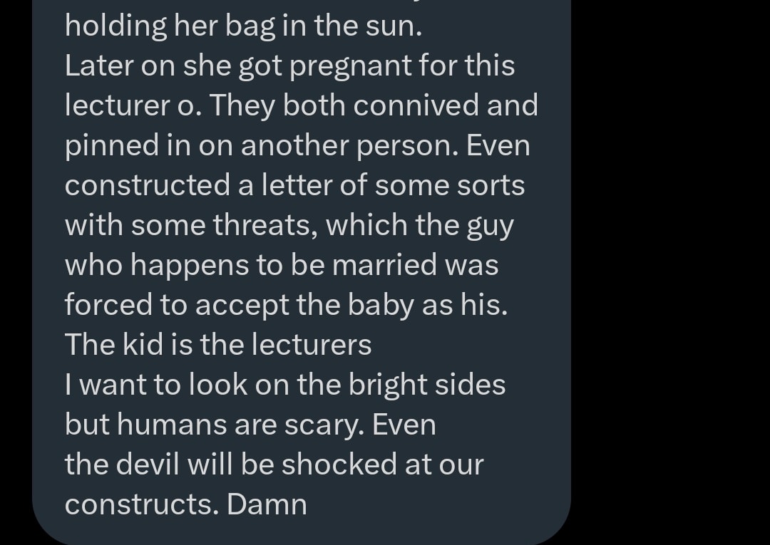 A Nigerian man has taken to social media to confess a shocking story about a female coursemate who allegedly got pregnant during an affair with a lecturer and then falsely pinned the pregnancy on her innocent boyfriend.