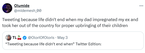 “Tweeting because life didn’t end when my dad impregnated my ex and took her out of the country for proper upbringing of their children”