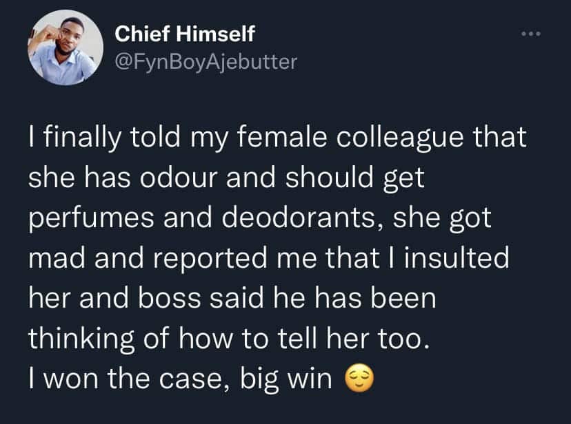 The Twitter user, @Chiefhimself said he advised the female colleague that she has odour and should get perfumes and deodorants.