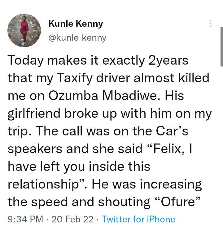 Today makes it exactly 2years that my Taxify driver almost killed me on Ozumba Mbadiwe. His girlfriend broke up with him on my trip.