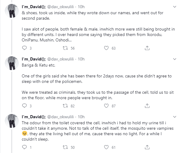 The young man revealed that he and others were bailed with N10,000, adding that a lady has been in the cell for two days after she refused to sleep with one of the officers.