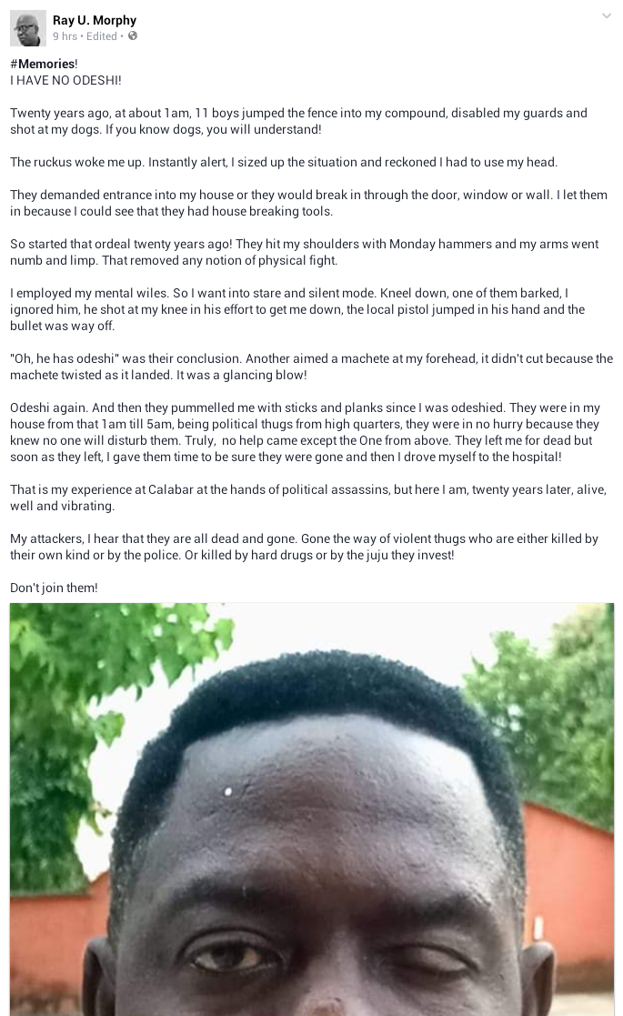 That is my experience at Calabar at the hands of political assassins, but here I am, twenty years later, alive, well and vibrating.