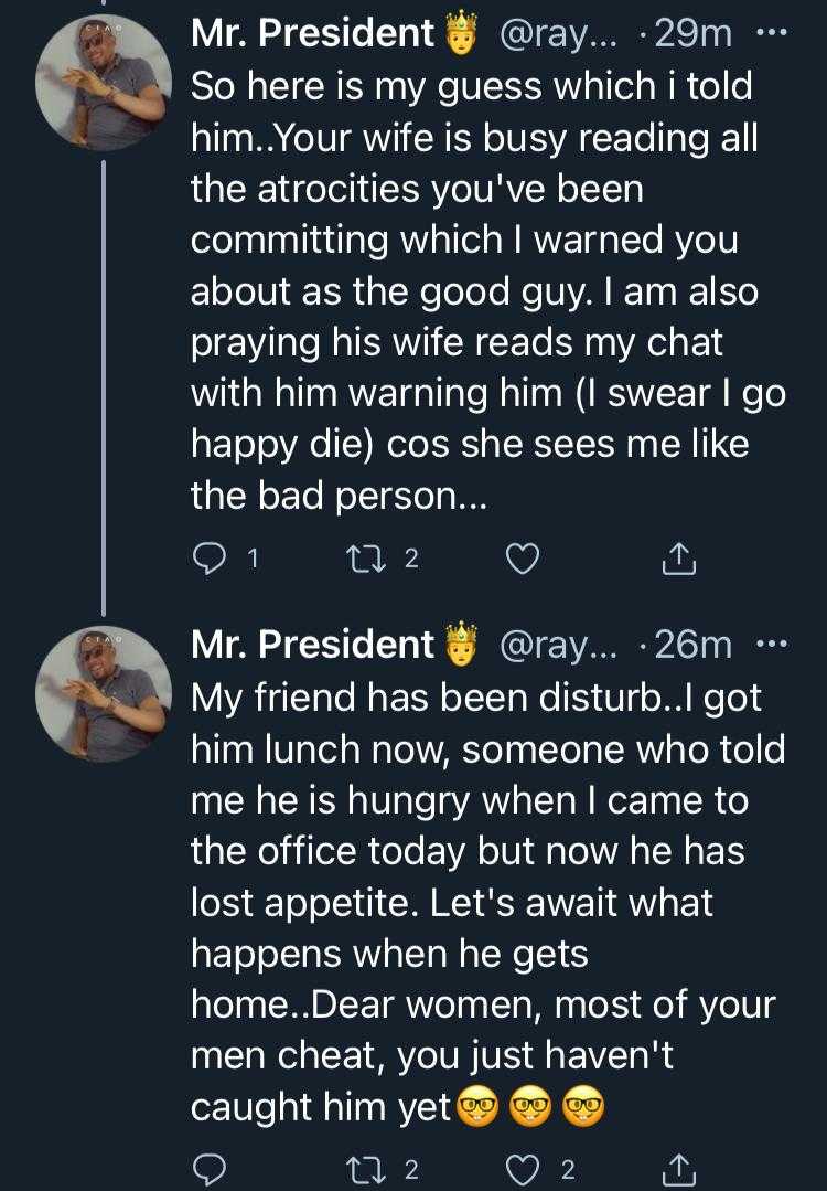 My friend has been disturb..I got him lunch now, someone who told me he is hungry when I came to the office today but now he has lost appetite. Let’s await what happens when he gets home..Dear women, most of your men cheat, you just haven’t caught him yet???”