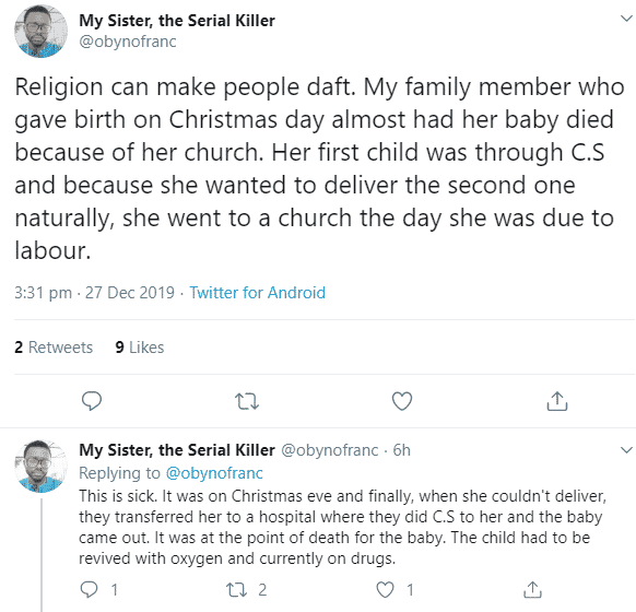 @obynofranc tweeted: “Religion can make people daft. My family member who gave birth on Christmas day almost had her baby died because of her church. Her first child was through C.S and because she wanted to deliver the second one naturally, she went to a church the day she was due to labour.