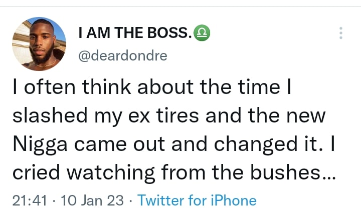 “I often think about the time I slashed my ex tires and the new Nigga came out and changed it. I cried watching from the bushes…”