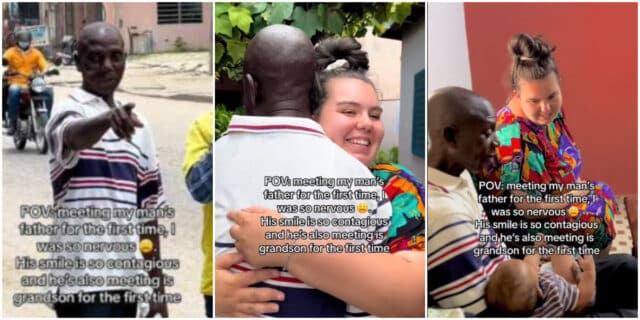 Man over the moon as he meets his son’s Oyinbo wife for the first time, they hug tightly