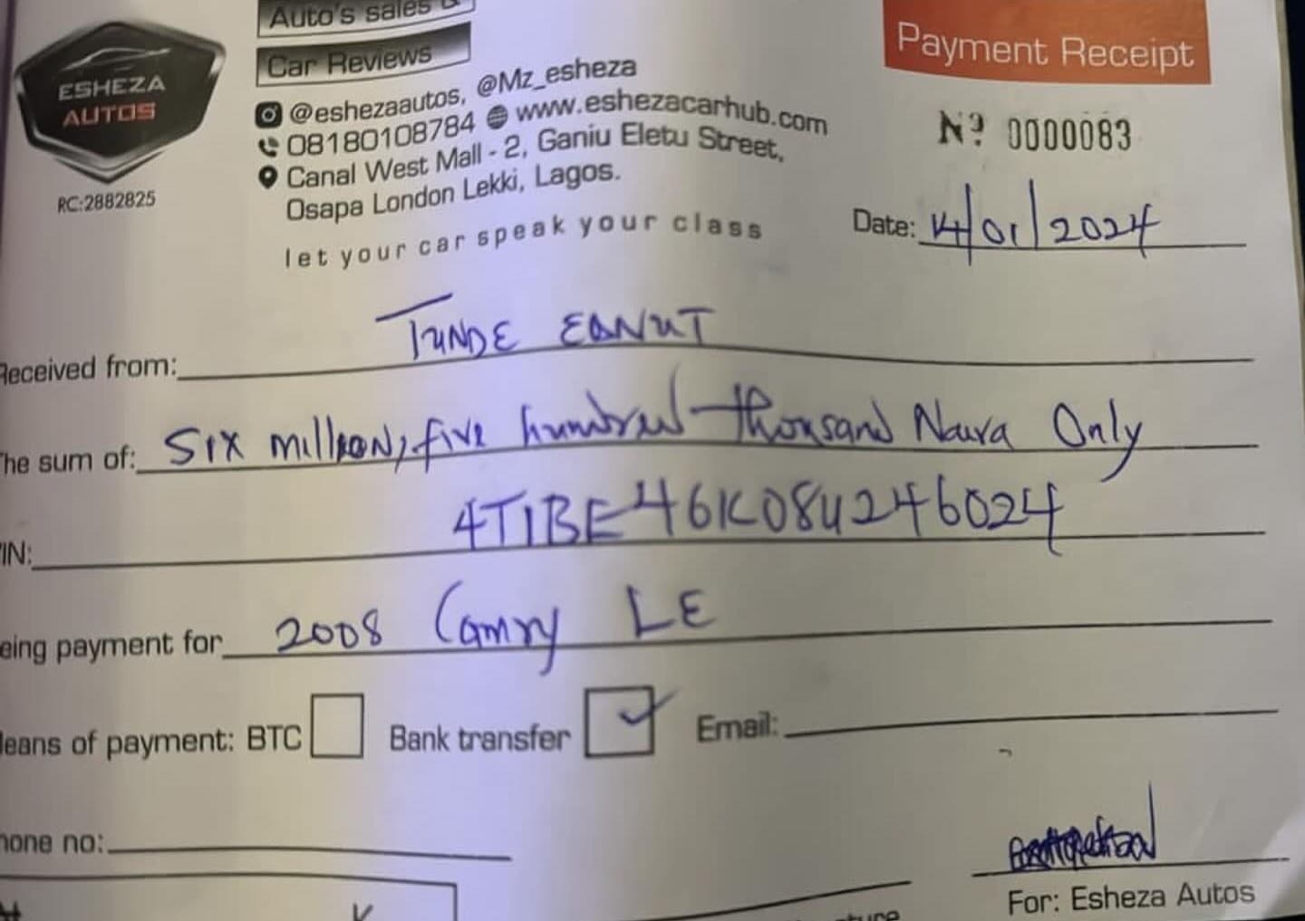 In a video making waves on social media, Tunde Ednut announced a fan identified as Johnson Linus as the winner of a 2008 Toyota Camry worth N6.5M.