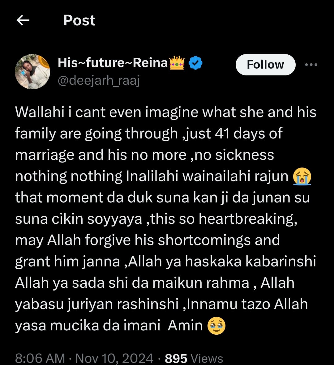 Confirming the loss, one user expressed sympathy: “Wallahi, I can’t imagine what she and his family are going through. Just 41 days of marriage, and he’s no more—no sickness, nothing. Inalilahi wainailahi rajun. At that moment, they were still so in love.”
