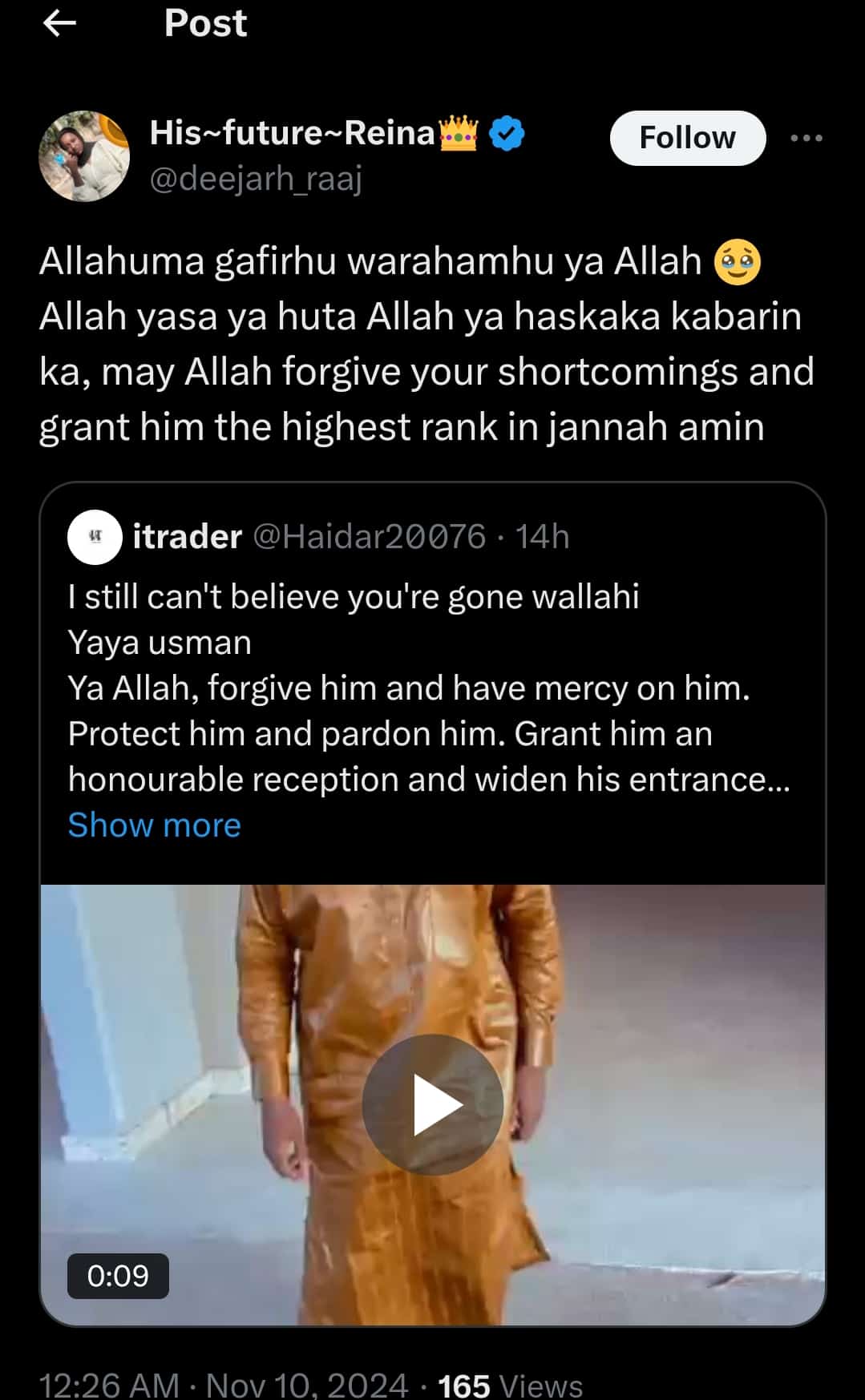 “This is heartbreaking. May Allah forgive his shortcomings and grant him Janna. Allah ya haskaka kabarinshi, Allah ya sada shi da maikun rahma. Allah yabasu juriyan rashinshi, Innamu tazo, Allah yasa mucika da imani. Amin.”