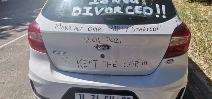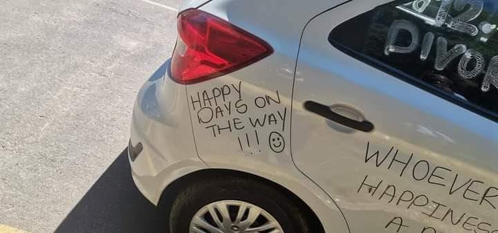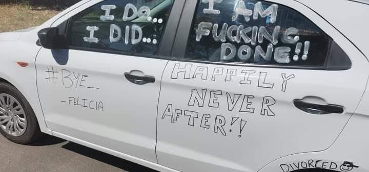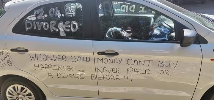 Man expresses overwhelming joy by defacing his car with ink stating how free he is as the court finally confirms his divorce to his wife.