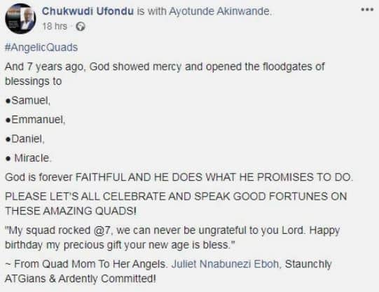 “And 7 years ago, God showed mercy and opened the floodgates of blessings to ●Samuel, ●Emmanuel, ●Daniel, ● Miracle. God is forever faithful and He does what he promises to do. Please let’s all celebrate and speak good fortunes on these amazing quads! “My squad rocked @7, we can never be ungrateful to you Lord. Happy birthday my precious gift your new age is bless.”