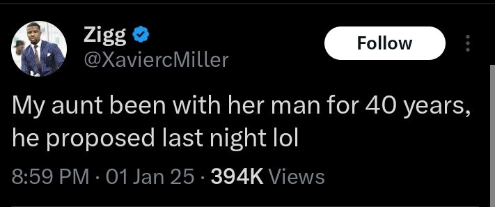 The tweet reads,”My aunt been with her man for fourty years, he proposed to her last night”.