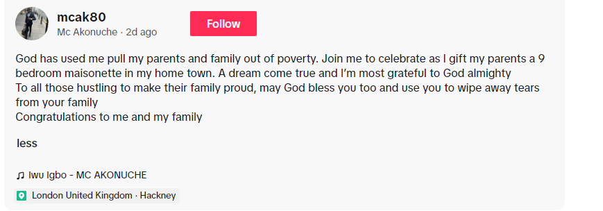 According to the UK-based man, God used him to bless his parents and pull them out of their poverty situation, and ushering them into a new house.