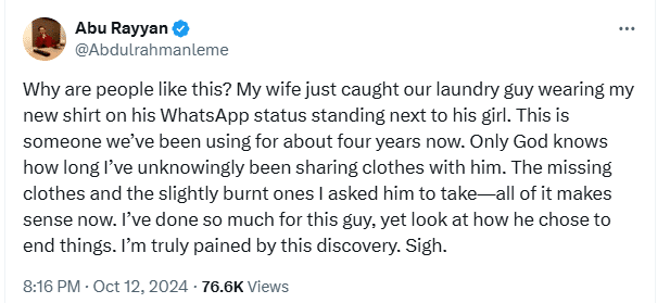 “Why are people like this? My wife just caught our laundry guy wearing my new shirt on his WhatsApp status standing next to his girl. This is someone we’ve been using for about four years now. Only God knows how long I’ve unknowingly been sharing clothes with him. The missing clothes and the slightly burnt ones I asked him to take—all of it makes sense now. I’ve done so much for this guy, yet look at how he chose to end things. I’m truly pained by this discovery. Sigh.”