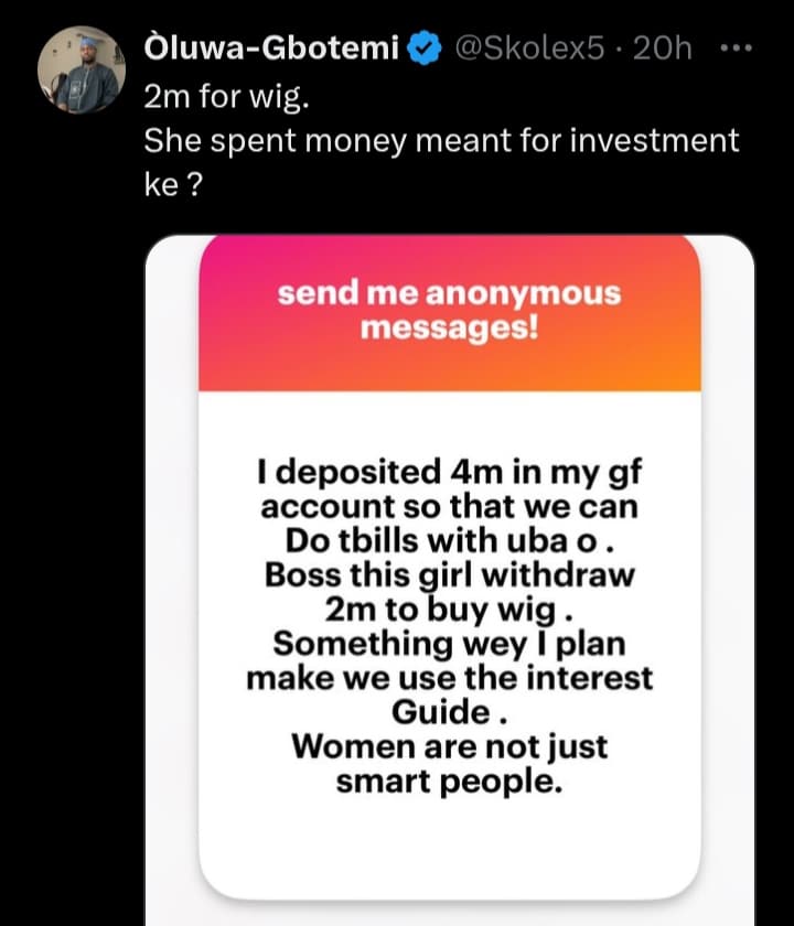 “I deposited 4m in my gf account so that we can Do tbills with ubao. Boss this girl withdraw 2m to buy wig. Something wey I plan make we use the interest Guide. Women are not just smart people.”