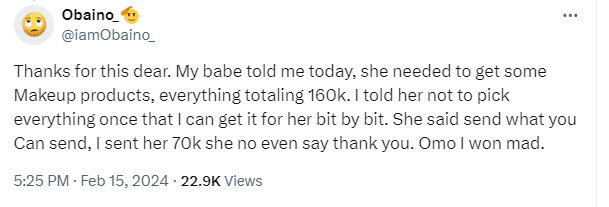 “Thanks for this dear. My babe told me today, she needed to get some Makeup products, everything totaling 160k. I told her not to pick everything once that I can get it for her bit by bit. She said send what you Can send, I sent her 70k she no even say thank you. Omo I won mad.”