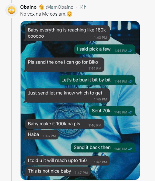Man rants as he leaks chat with unappreciative girlfriend after sending her N70K out of N160K for makeup items