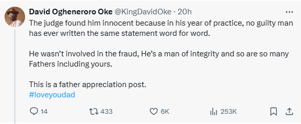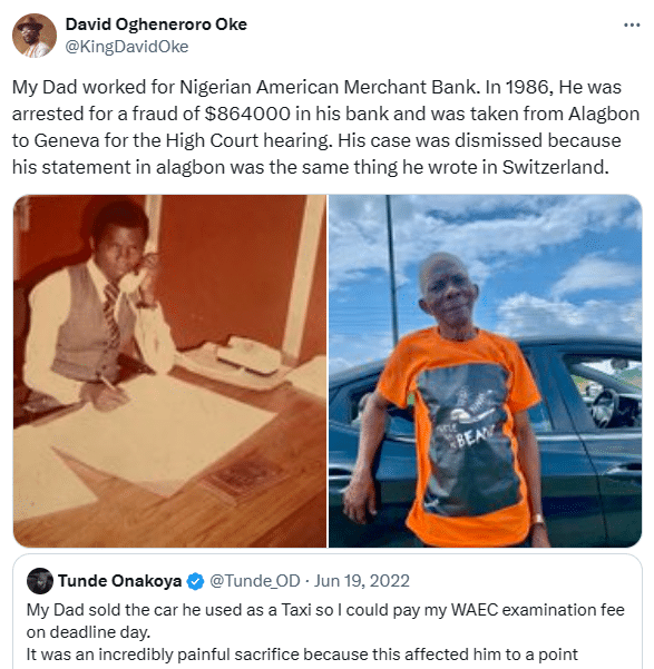 The man @KingDavidOke took to X to publicly celebrate his father’s act of integrity during his lifetime as a young banker in the 80s.
