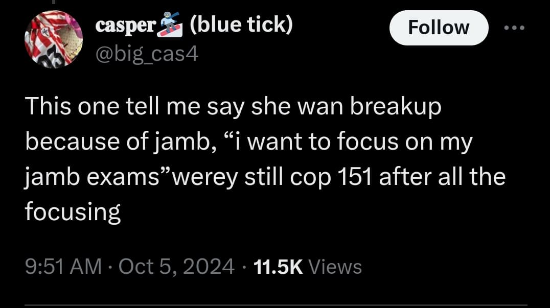 He wrote: “This one tell me say she wan breakup because of jamb, “i want to focus on my jamb exams”werey still cop 151 after all the focusing.”