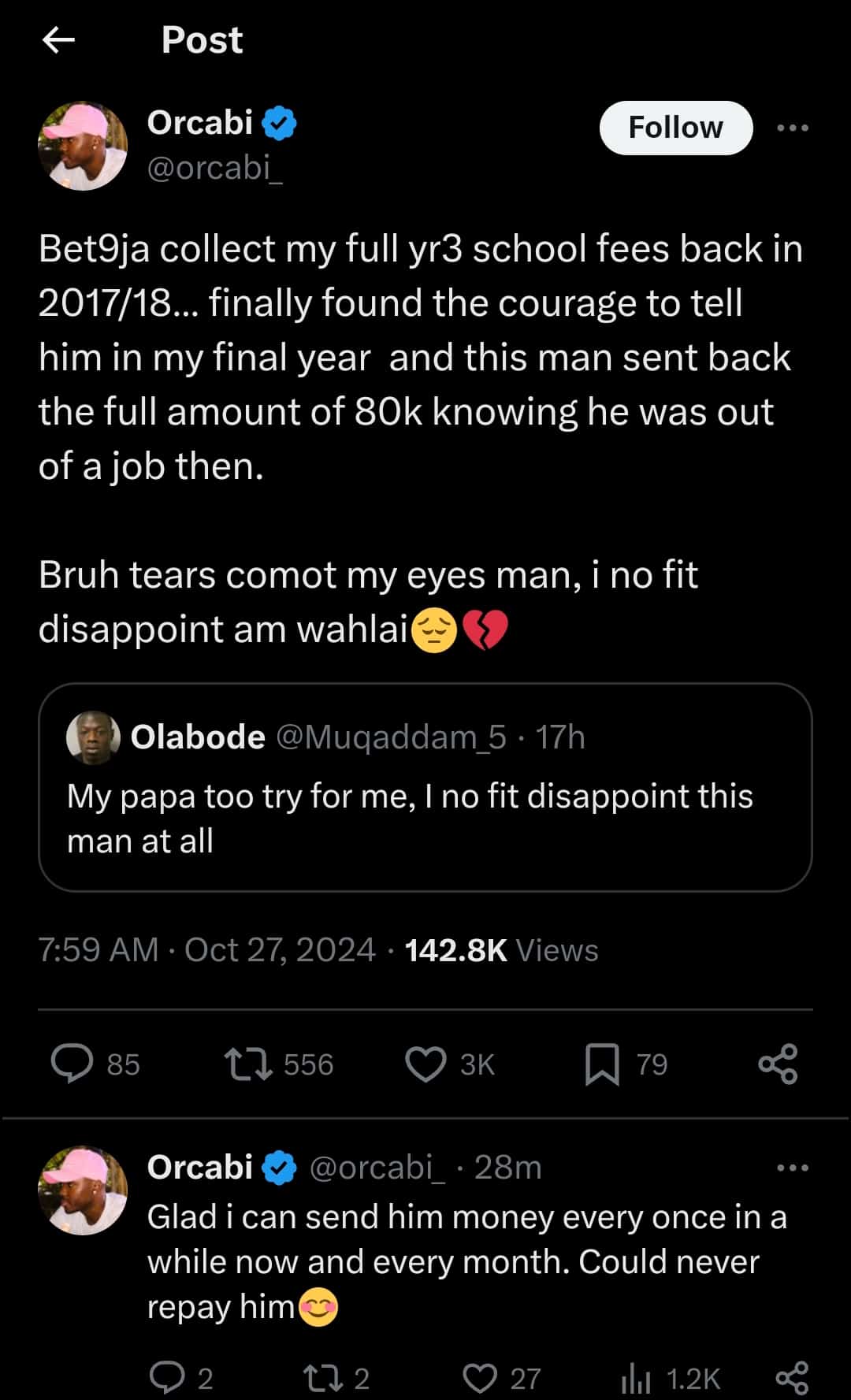 Expressing his gratitude, the man wrote, “Bet9ja collected my full year 3 school fees back in 2017/18. I finally found the courage to tell him in my final year, and this man sent back the full amount of 80k knowing he was out of a job then. Bruh, tears came to my eyes, man. I can’t disappoint him, wahlai 😔💔.”