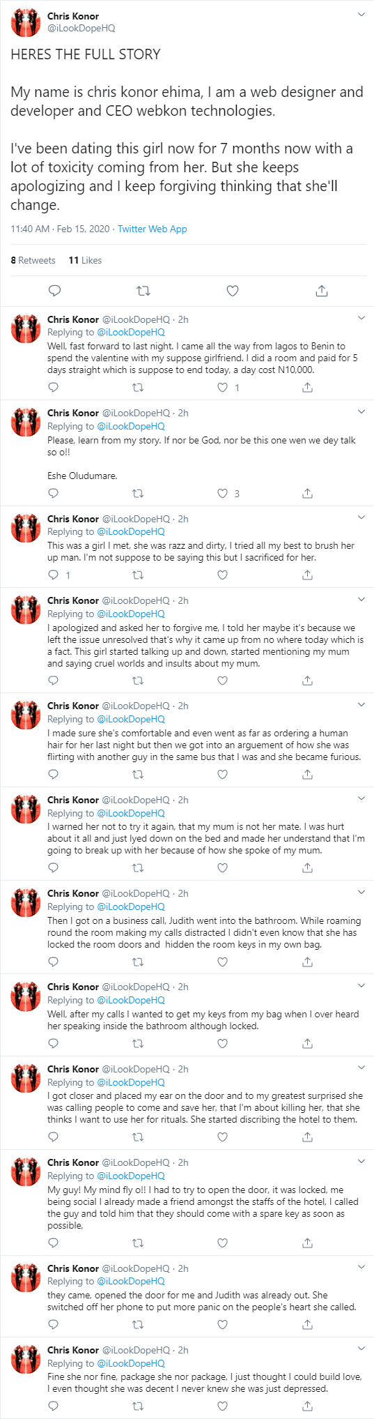 According to him, he planned spending time with his girlfriend in an hotel he paid 10k for 5 nights after travelling from Benin to Lagos to see her only to overhear her telling people over the phone that he is about to use her for money ritual.