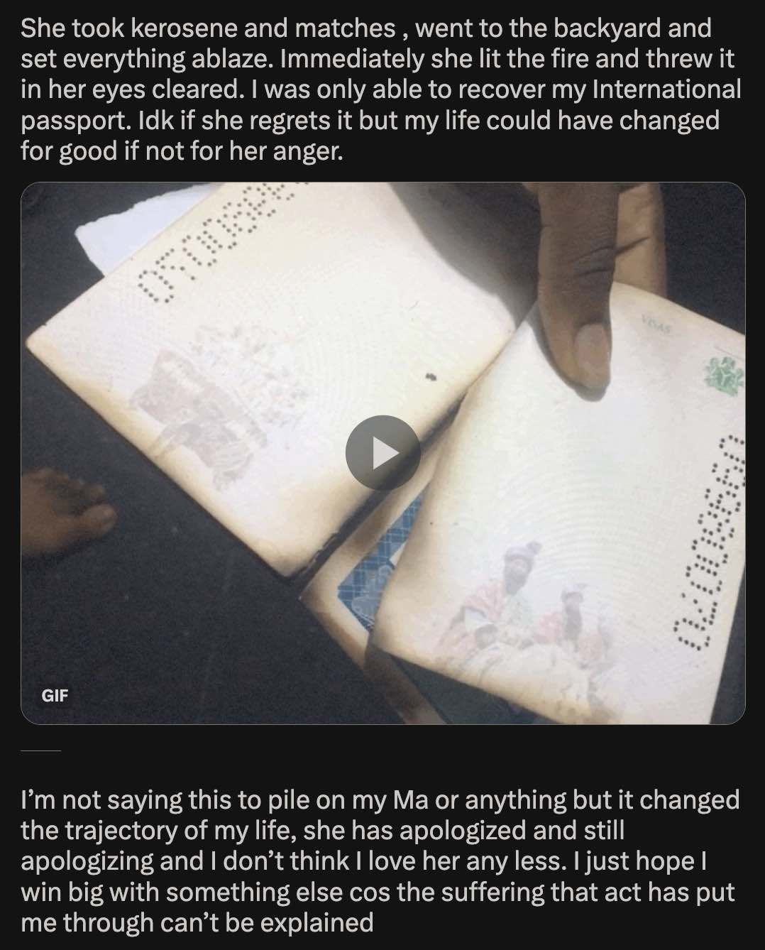 “Immediately she lit the fire and threw it in her eyes cleared. I was only able to recover my International passport. Idk if she regrets it but my life could have changed for good if not for her anger.”