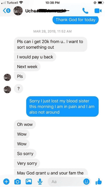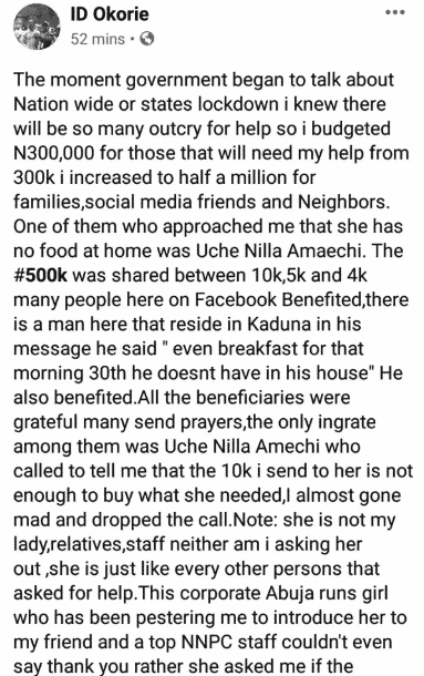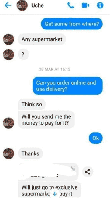 Facebook user, ID Okorie took to the platform to share screenshots of his chat with a Facebook friend who he sent 10,000 to stock up before the lockdown begins.