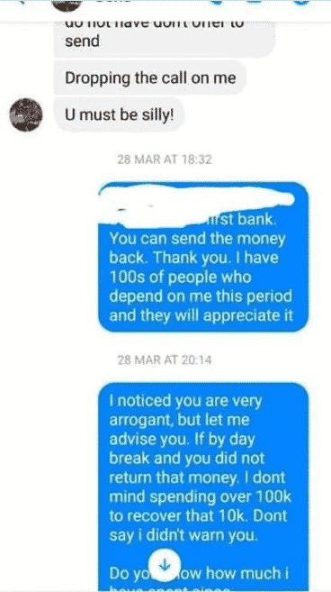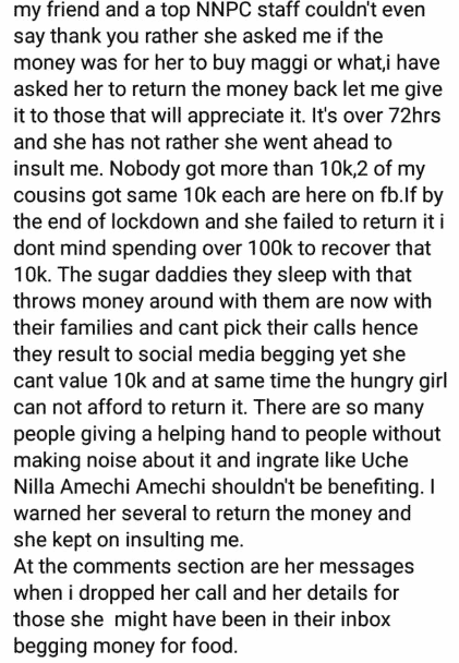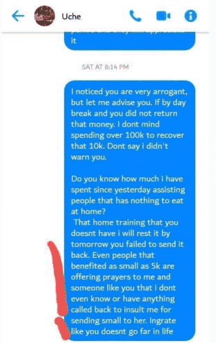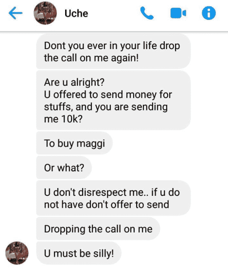 The chat shows the woman insulting him for sending her only 10K. She asked what 10K will buy then called him out for dropping the call on her when they spoke to discuss the money sent.