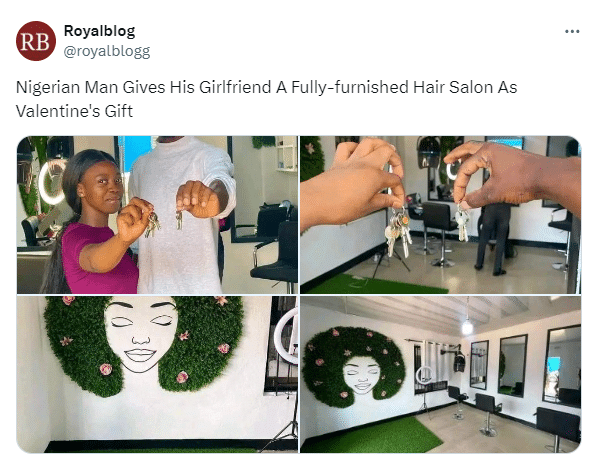Nigerian man warms hearts as he allegedly gives girlfriend a fully-furnished hair salon as Valentine’s gifts.