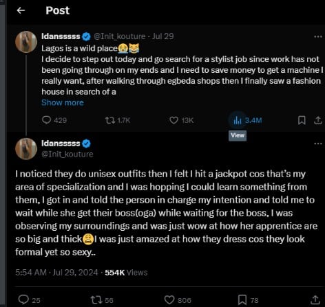 She wrote; “Lagos is a wild place, I decided to step out today and go search for a stylist job since work has not been going through on my end and I need to save money to get a machine I really want, after walking through egbeda shops then I finally saw a fashion house in search of a stylist and decide to go try my luck..