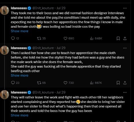 The employer had to sack the man after learning of how he’s been sleeping with the apprentices in her store and that spot that remained vacant is what she wanted, @Init_kouture to fill.
