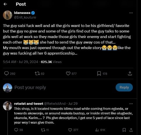 The guy sabi fxxk well and all the girls want to be his girlfriend/ favorite but the guy no gree and some of the girls find out the guy talks to some girls well at work so they make those girls their enemy and start fighting each other 😹😹😹 she had to send the guy away cos of that. My mouth was just opened through out the whole story😭😭😭like the guy was fucking all her 6 apprenticeships…